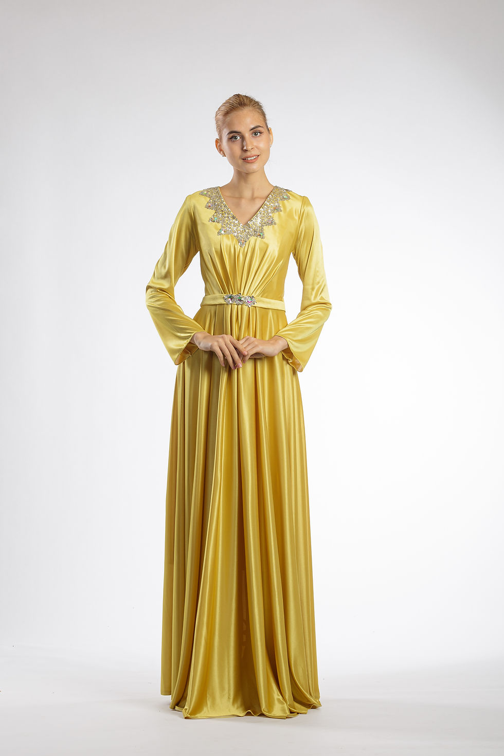 Mustard Embellished Long Sleeves Belted Satin Evening Dress